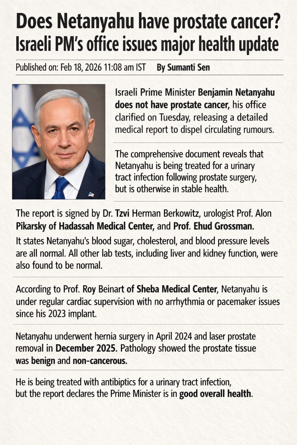 The report also details that Netanyahu underwent surgery in April 2024 to repair a right inguinal hernia. A pre-surgical CT scan had revealed an enlarged prostate, small bladder stones and a bladder obstruction. In December 2025, he underwent laser-assisted prostate removal. Pathology results confirmed the tissue was benign and non-cancerous.