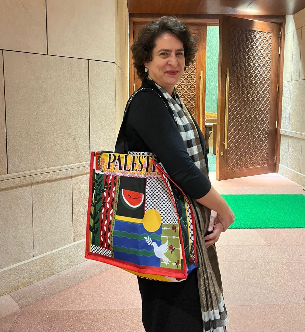 New Delhi — In a show of support for the people of Palestine, Congress MP Priyanka Gandhi Vadra on Monday carried a bag to Parliament that had “Palestine” emblazoned on it.