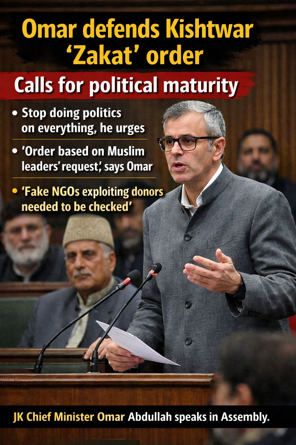 Jammu, Feb 20 (PTI) Jammu and Kashmir Chief Minister Omar Abdullah called for political maturity on Friday, urging lawmakers to “desist from doing politics on everything”, after a government order regarding “Zakat” (alms) collection was painted as interference in religious matters.