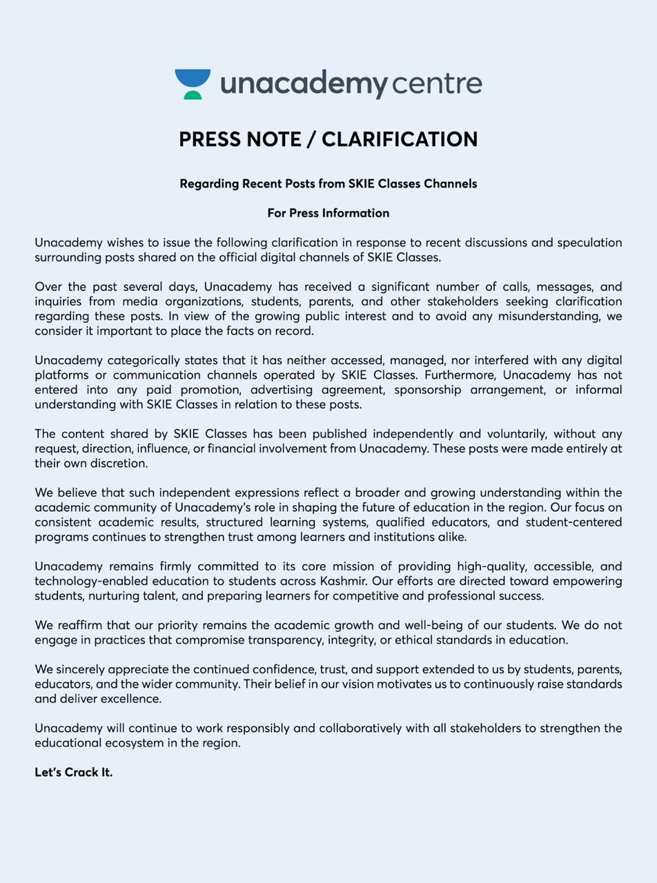 Unacademy has issued this press release to provide clarification in response to recent discussions and speculation surrounding posts shared on the official digital channels of SKIE Classes.